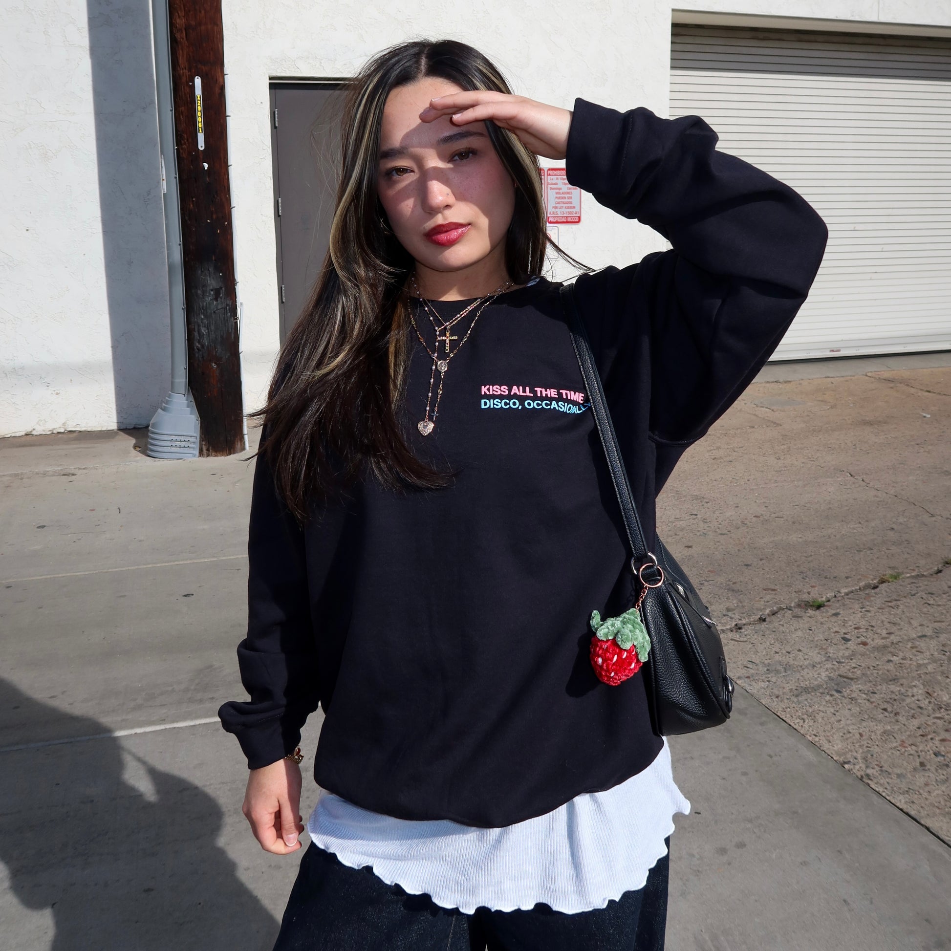-Standard unisex sizing, size up once for an oversized fit, Hana is wearing size large crew (left) and Claire is wearing size XL hoodie (right)