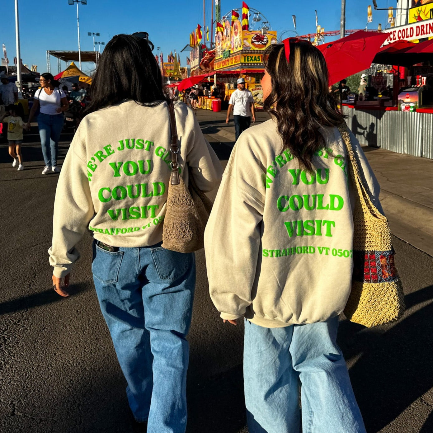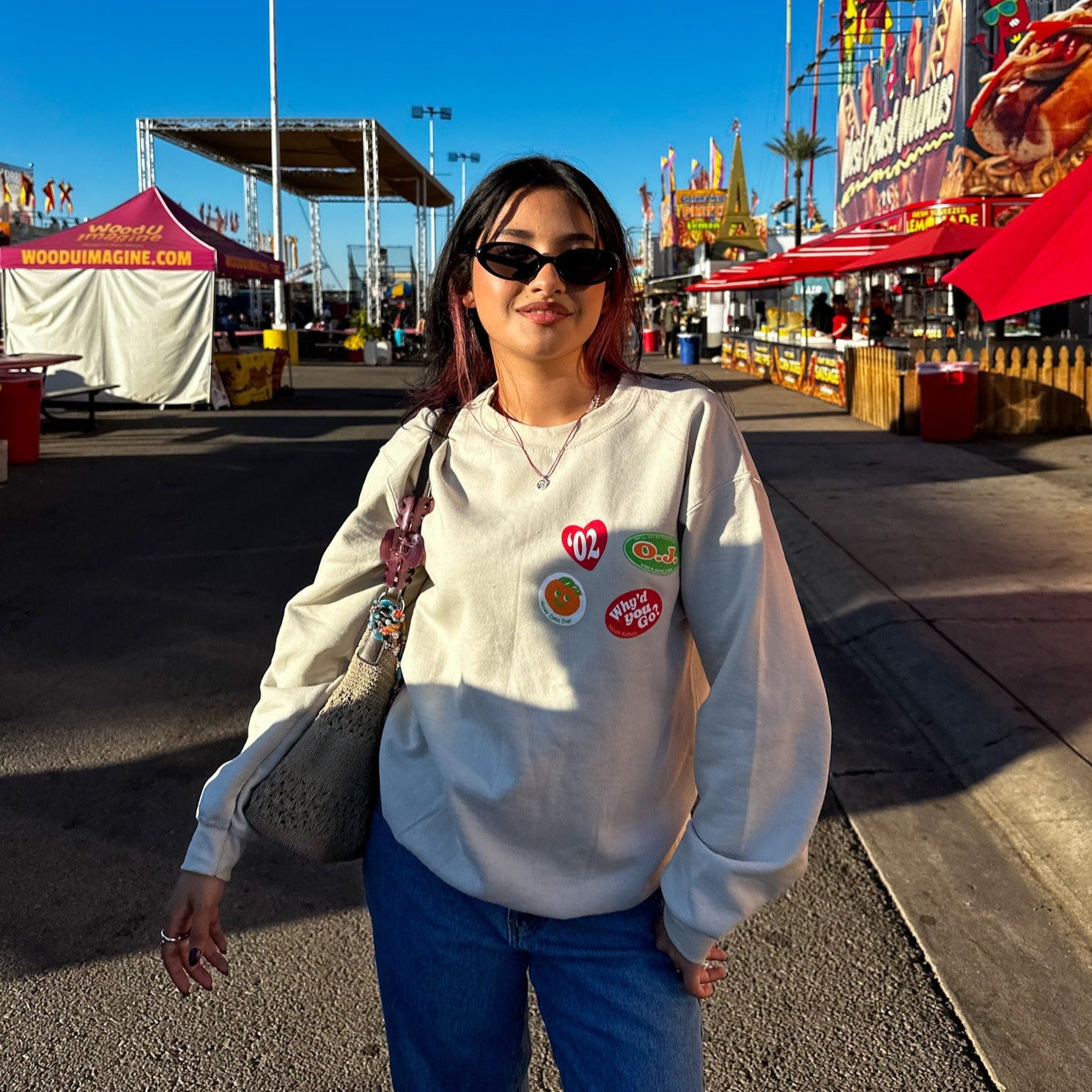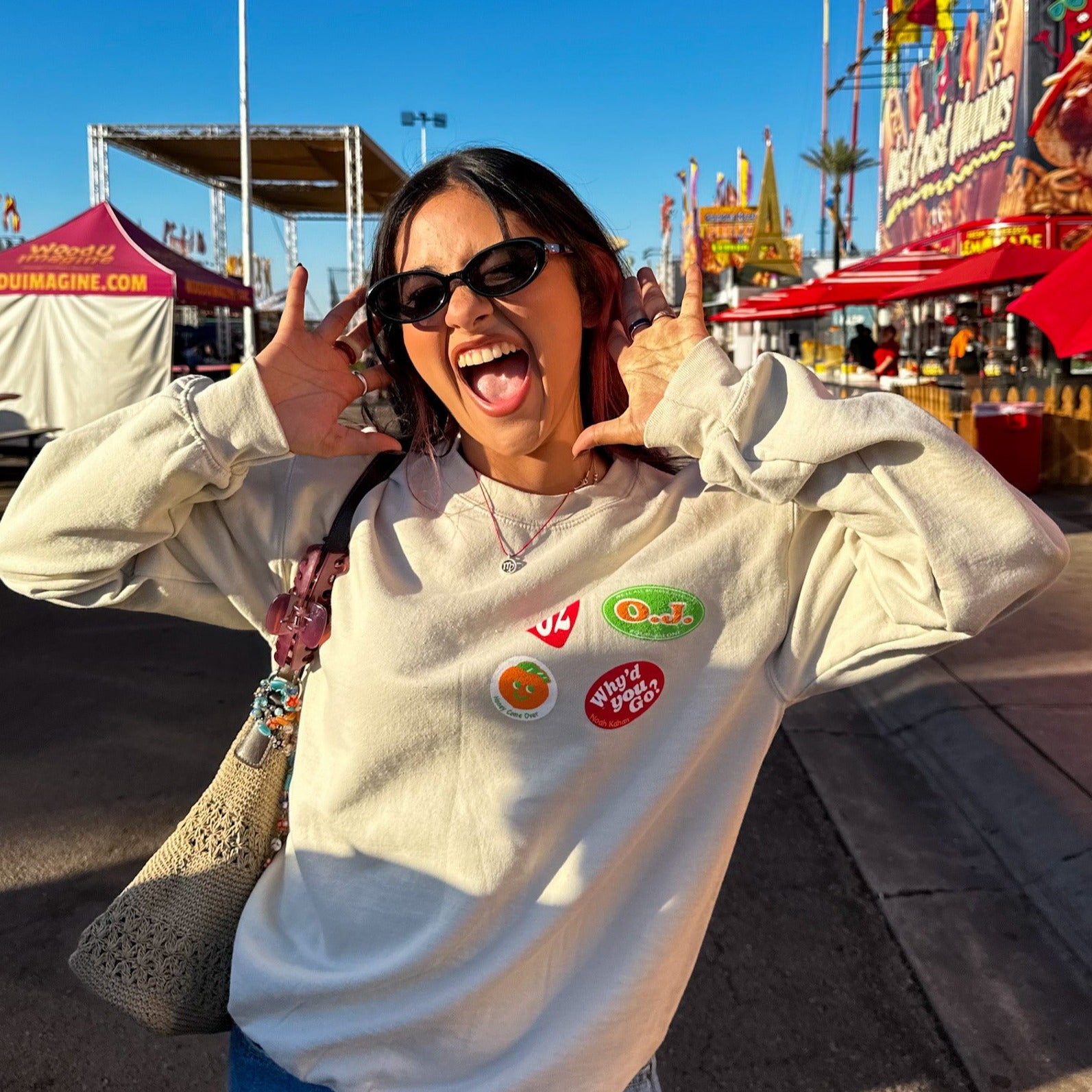 -Fruit sticker crewneck made with specialty puff and felt ink